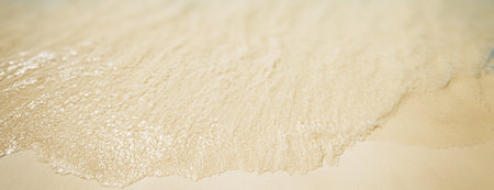 Closeup sea surf and sand beach at sunny day. Neural network generated in May 2023. Not based on any actual scene or pattern.