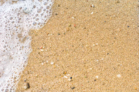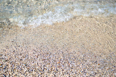 A background of sand, small pebbles and flowing waves on the sea beach. Summer vacation and coastal nature concept