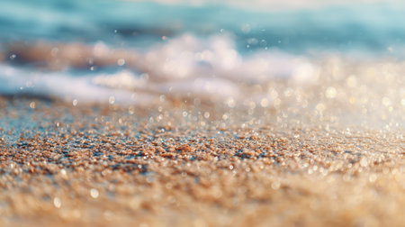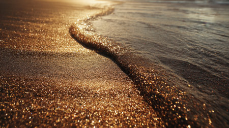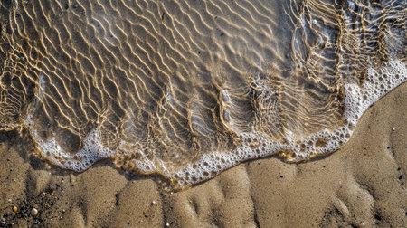 A close up of a sandy beach with waves crashing onto the shore, showcasing the beauty of natures water and wind waves in a natural landscape AIG50