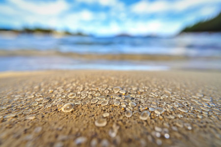 Sandy beach and sea foam macro with narrow focus background. Texture of a splash of bubbles and grains of sand.