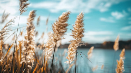 Generative AI : Wild sedges on the shore of a lake at sunset