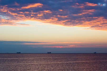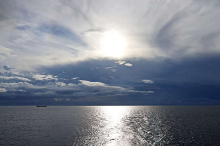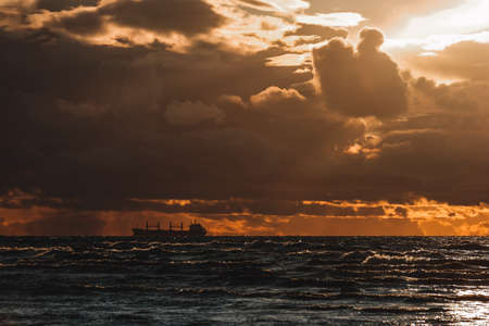 Sun setting at the sea with sailing cargo ship, scenic view. Clouds and storming sea. Defocused.