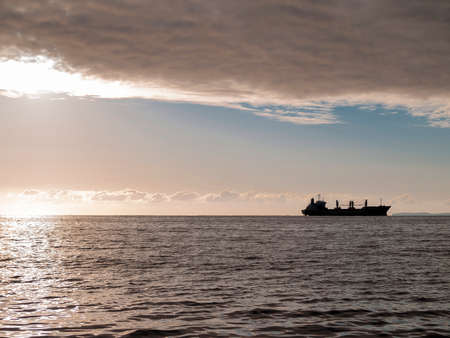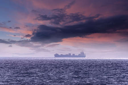 Large cargo ship sailing at sunset. Baltic sea. Panoramic view from a sailboat. Freight transportation, logistics, global communications, economy, business, industry