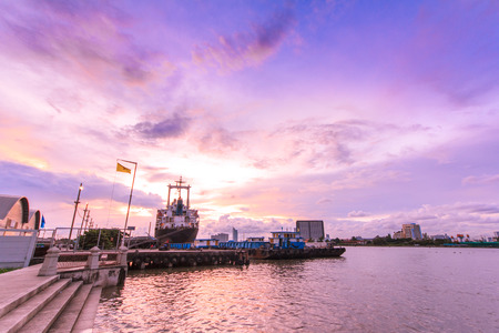 The pier and cloudy sky in evening with the giant transport ship above the river in Bangkok, Thailand.