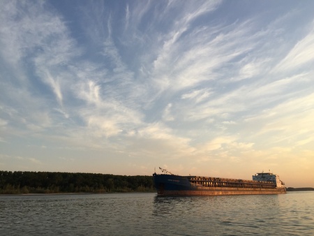 barge on river on suset background