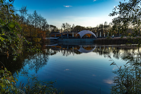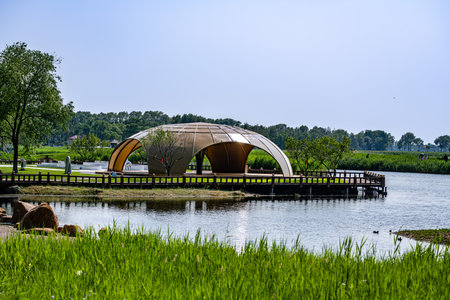 Wooden pier of round shape on the river bank, park for walking on the pond, country house with a view of the lake, art object in the city, a place for people to relax, relaxation and silence.