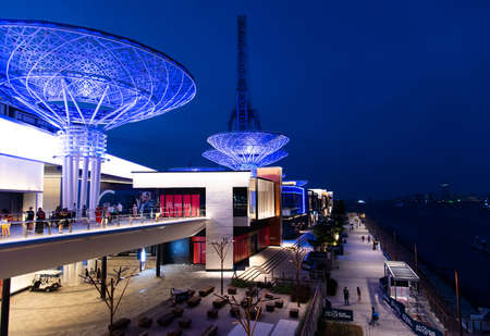 Dubai, United Arab Emirates - November 16, 2018: Bluewaters island promenade at night, new walking area with shopping mall and restaurants, newly opened leisure and travel spot in Dubai