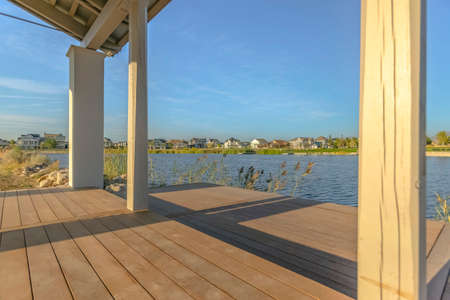 Picnic pavilion and playground with view of lake snow peaked mountain and sky. Houses can also be seen around the recreational park.
