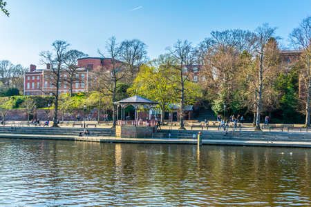 STRASBOURG, FRANCE - SEP 19 2017: Aerial still drone view of Canal de Marne au Rhin with Council of Europe Agora building in the background in summer evening with pedestrian walking near the canal