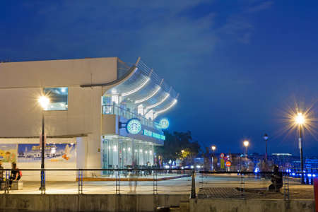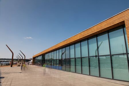 A building with windowed walls and a white roof on the harbor with the Mediterranean sea view (Pesaro, Italy, Europe)