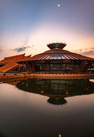 Traditional Chinese Pavilion on Water with Reflective Lake and Classic Architecture