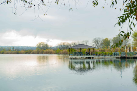 Pond and pavilion view at Gyeongsanggamyeong aka central park in Daegu South Korea