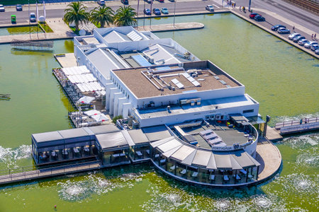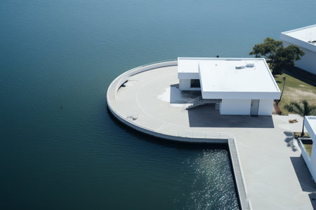 Captivating Aerial View: Serene Body of Water Neighboring Stunning White Building