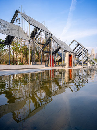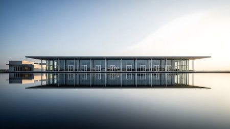 Modern architecture reflected in still water.