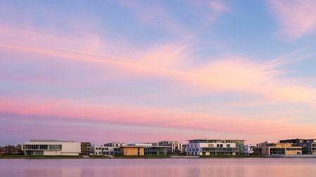 Pink showing modern buildings on waterfront at sunset with pink and blue clouds keywords: modern, buildings,...