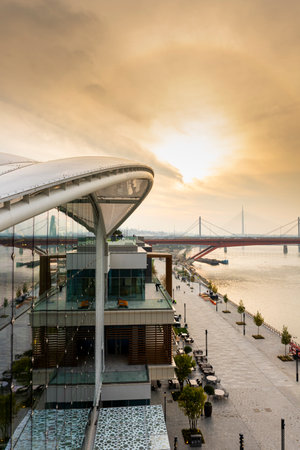 BELGRADE, Serbia - November 23, 2020: Shopping mall named Galerija at Belgrade Waterfront. Luxury area in the city by the Sava river. With amazing view of the river and sunset sky