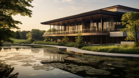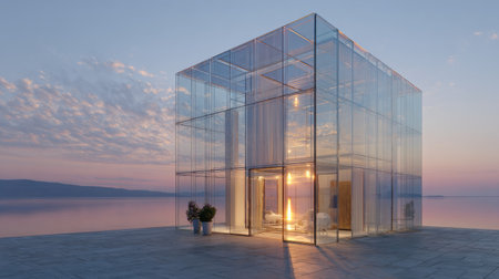 A sleek glass building stands near calm waters, reflecting the colors of sunset and offering a peaceful retreat in a beautiful natural setting