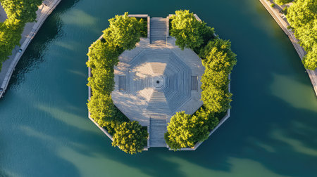 This aerial image captures a stunning octagonal deck framed by lush green trees, surrounded by calm water, creating a serene park view ideal for relaxation.