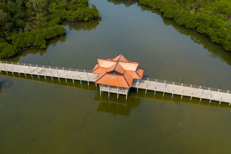 Aerial image presents a striking pavilion with an angular red roof at the center of a long walkway crossing shallow green water near dense mangrove forest at Long Set Beach, Koh Rong, Cambodia. The symmetrical structure and tranquil wetland setting create a minimal, serene composition.