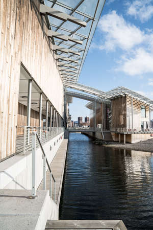 STRASBOURG, FRANCE - SEP 19 2017: Aerial still drone view of Canal de Marne au Rhin with Council of Europe Agora building in the background in summer evening with pedestrian walking near the canal