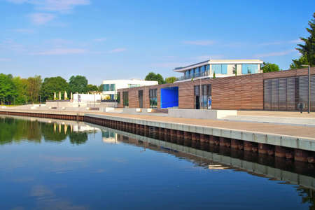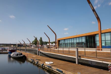 Modern and wooden marina club building in Szczecin, Poland. Boats, motorboat moored at the bank.
