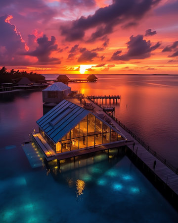 Generative AI : Aerial view of bungalows of a luxury hotel on Huvafen Fushi island at sunset on Maldives archipelagos