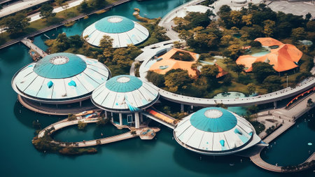 Futuristic modular office buildings with sleek, modern architecture appear to float on calm water, their reflections creating a surreal and innovative scene.