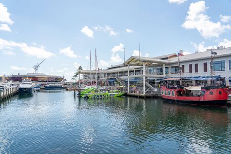 Miami, USA - September 11, 2019: View of the Marina in Miami Bayside with modern buildings and skyline in the background