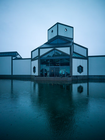 Twilight view of a contemporary building with a dynamic silhouette and reflective water feature.