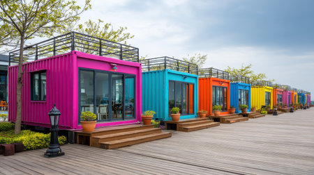 This vibrant image showcases a row of colorful shipping container cabins on a waterfront boardwalk, surrounded by lush greenery against a cloudy sky.