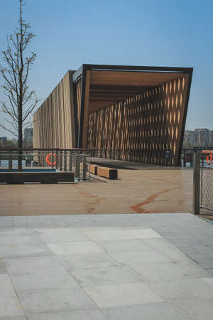 Wooden pier stands on the water, round pier, city park by the water, pond for relaxation, meditation area, morning light rays of the sun, no people. high quality photo