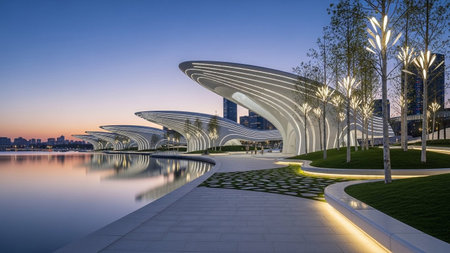 A view of modern, futuristic architectural structures lining a waterfront at twilight. The buildings feature sleek, curved with integrated white LED lighting that accentuates their flowing forms. Illuminated trees with unique light are scattered throughout the landscaped park area. The calm water reflects the city lights and the sky, creating a serene and atmosphere. captures a blend of innovative architecture and urban landscape