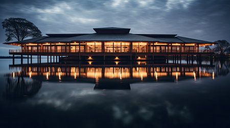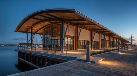 A contemporary pavilion with a distinctive curved roof stands elegantly on the waterfront at dusk. Illuminated by warm lights, its glass facade reflects the twilight sky, creating a serene ambiance.