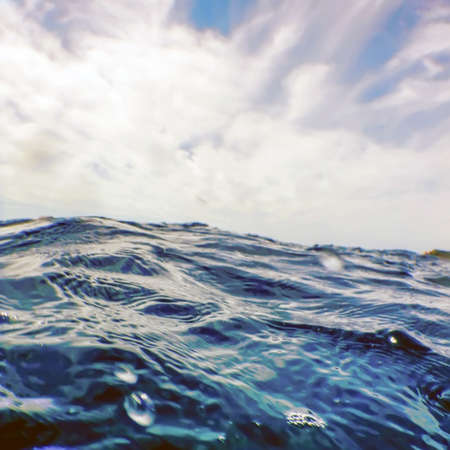 Blue sea wave with white clouds. Close-up of water surface.