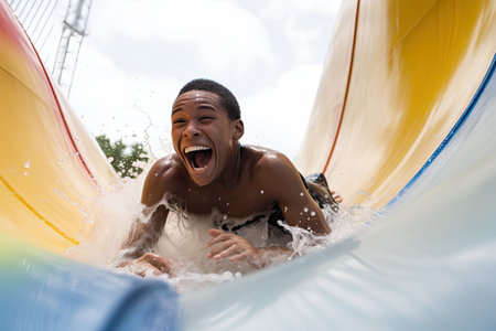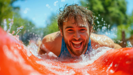 Joyful Man Sliding on Water Slide in a Summer Park Adventure.