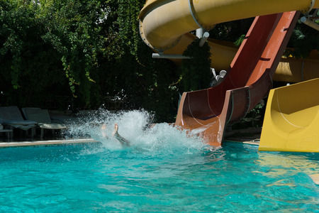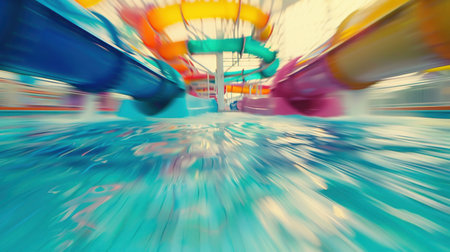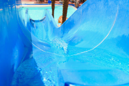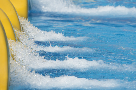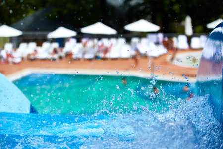 Water entering swimming pool from aqua park slide creating splash motion abstract effect