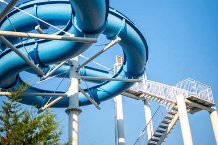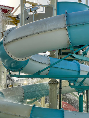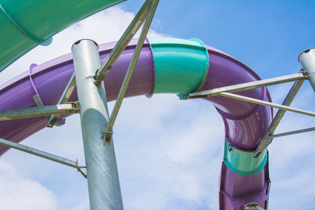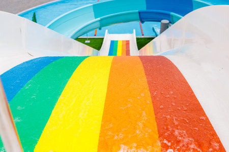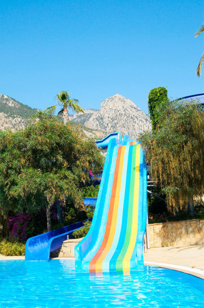 Water slide amusement park tourist attraction summer kids festivity festival joy pool with blue clear water vacation leisure time aquapark fast sliding pipes colorful resort entertainment center