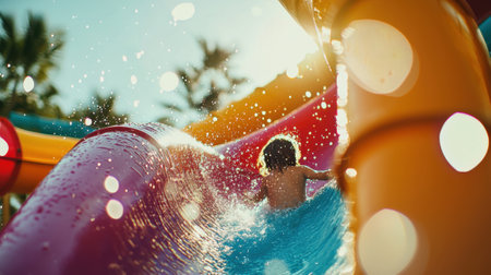A child gracefully slides down a colorful water slide, creating a splash as sunlight sparkles on the water. Palm trees frame the cheerful atmosphere, capturing the essence of summer fun.