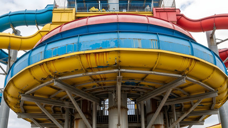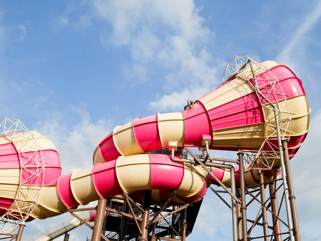 A low-angle view of a complex water park structure featuring winding slides in bright blue, yellow, and red colors. The industrial metal supports contrast with the playful plastic tubes against a cloudy sky.