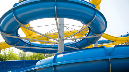 A low-angle view of twisting blue and yellow water slides at an amusement park. The bright colors and complex structure evoke feelings of summer fun and thrilling aquatic recreation.