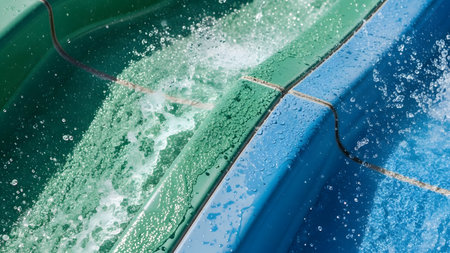 Clear water splashes energetically over the edge of a blue and green water slide. The glistening droplets and vibrant colors capture the excitement and refreshing nature of summer water park activities.