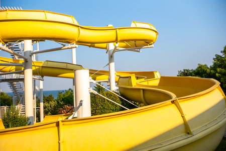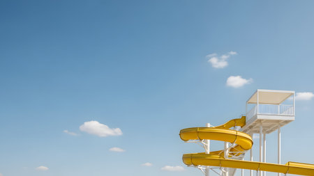 Yellow spiral water slides at a water park against a clear blue sky with white clouds. Minimalist summer recreation architecture.
