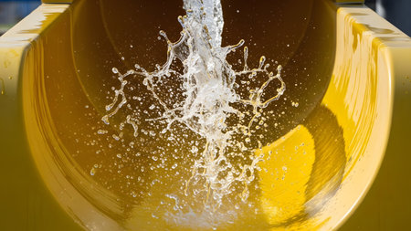 A vibrant yellow water slide features a dramatic splash of water gushing down the chute. The dynamic action shot captures the essence of summer fun, excitement, and refreshment at a water park or pool.