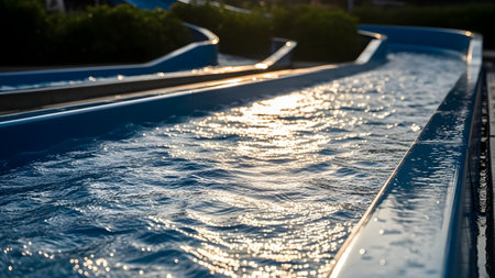 A close-up view of water rushing down a blue water slide illuminated by bright sunlight. The sparkling texture of the water and the curved blue surface evoke the excitement of summer water parks and vacation fun.