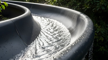 Clear water flows rapidly down a curved, silver metal channel in an outdoor setting. The sunlight reflects off the rippling water surface, creating a dynamic and refreshing industrial abstract scene.