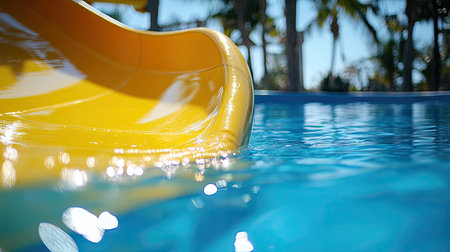 Close-up of a bright yellow water slide curving into a clear blue pool, with reflections of palm trees on the water's surface on a sunny day