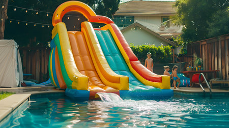 Bright inflatable water slide next to a clear pool, with children enjoying playful moments in the background, capturing the essence of summer joy and family bonding