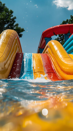 Vibrant water slide features bright colors and splashes of water, inviting excitement and joy in a summer setting, perfect for family fun and recreation
