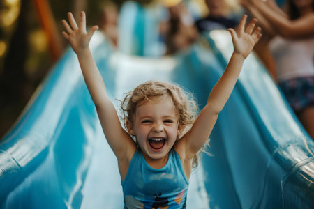 Young child feeling joy and excitement on a playground slide. They raise their hands, feeling exhilarated and carefree