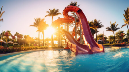 A captivating view of a water slide leading into a crystal-clear pool during sunset, showcasing glimmering water, inviting luxury in a serene outdoor environment.